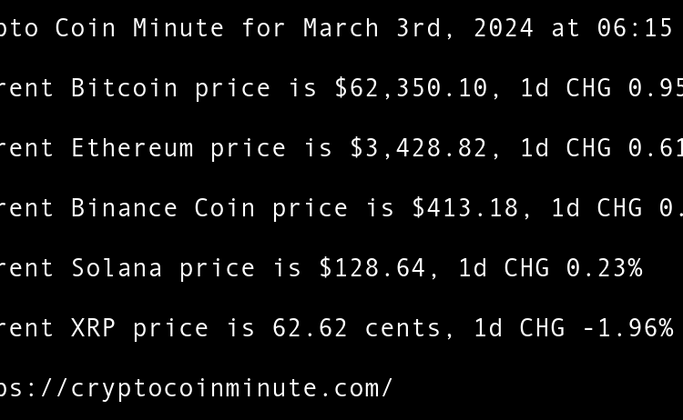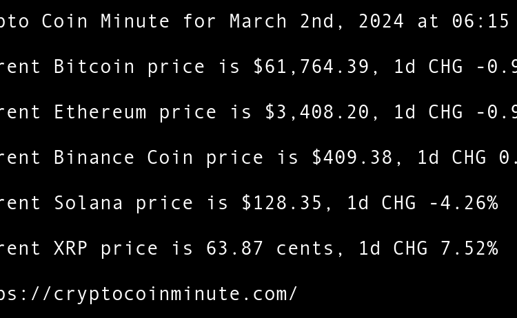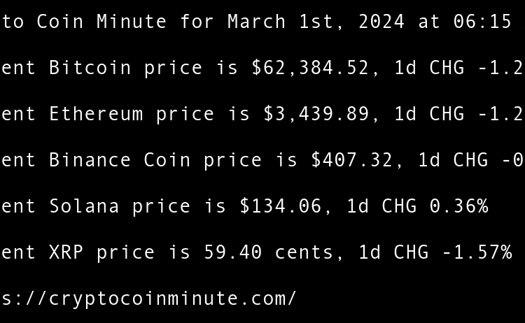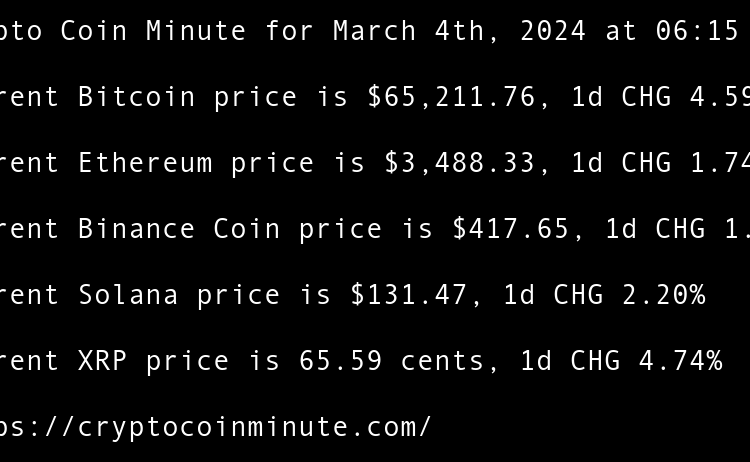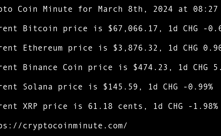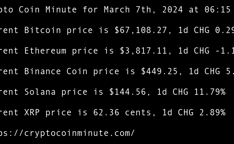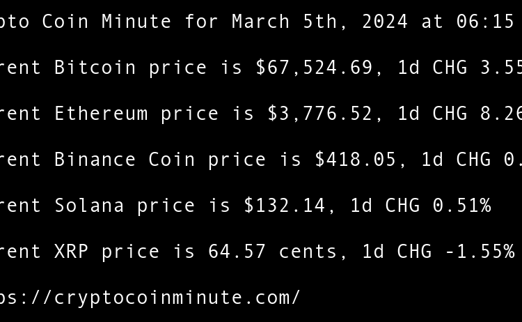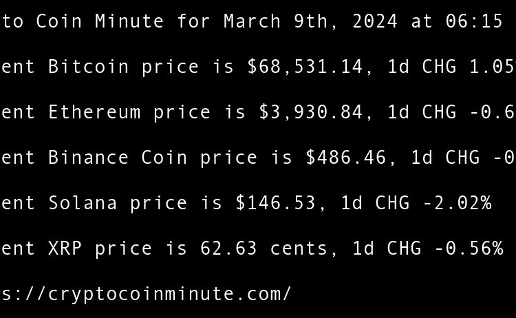 Current Bitcoin price is $68,531.14, 1d CHG 1.05% Current Ethereum price is $3,930.84, 1d CHG -0.69% Current Binance Coin price is $486.46, 1d CHG -0.14% Current Solana price is $146.53, 1d CHG -2.02% Current XRP price is 62.63 cents, 1d CHG -0.56% Wyoming Gov. Mark …