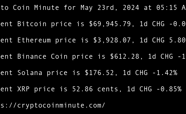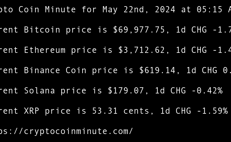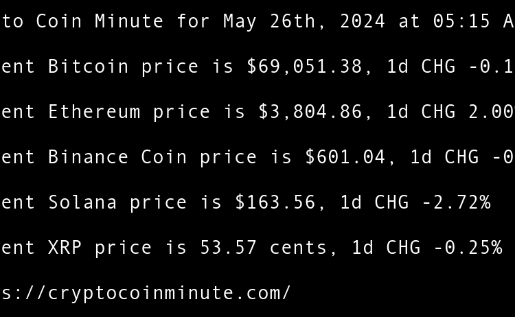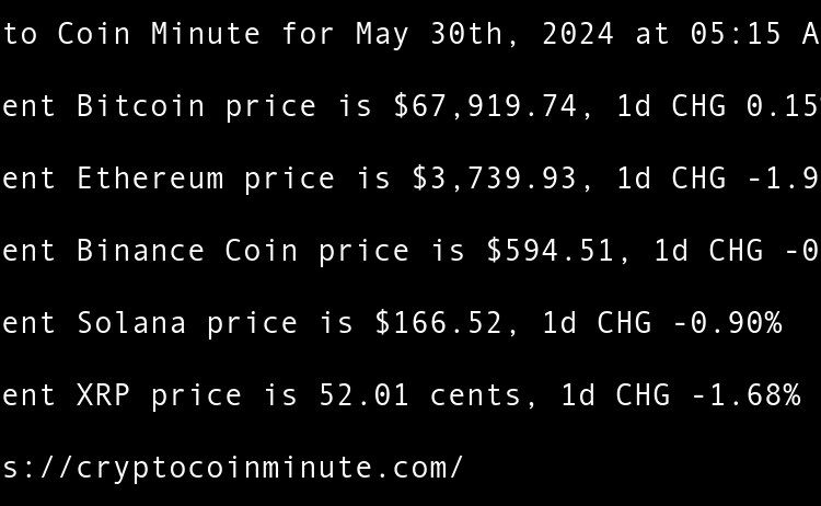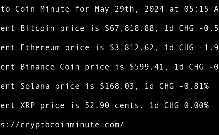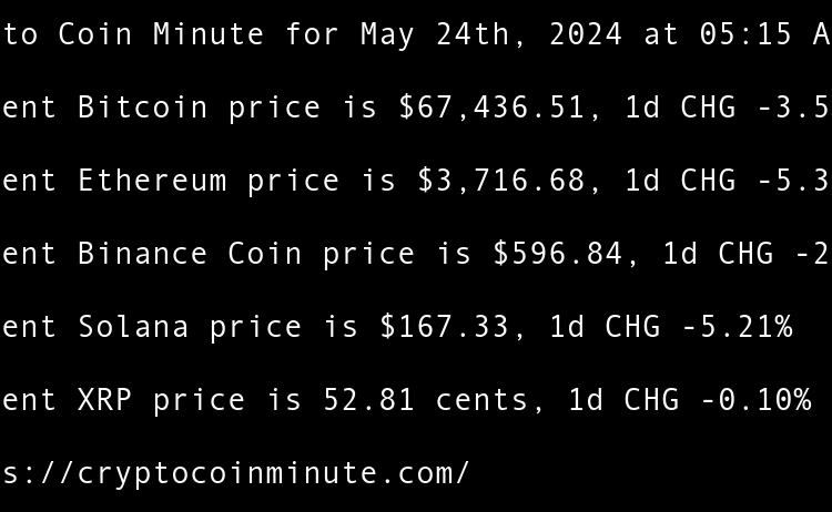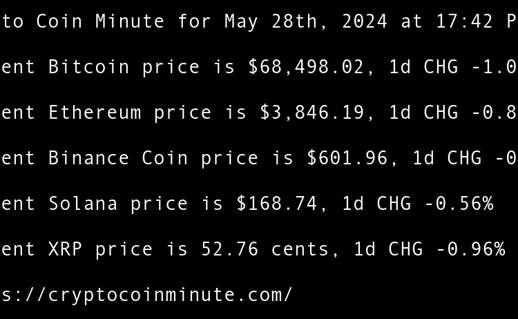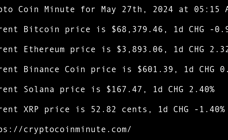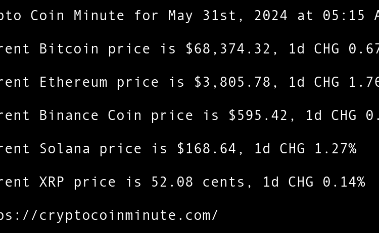 Current Bitcoin price is $68,374.32, 1d CHG 0.67% Current Ethereum price is $3,805.78, 1d CHG 1.76% Current Binance Coin price is $595.42, 1d CHG 0.15% Current Solana price is $168.64, 1d CHG 1.27% Current XRP price is 52.08 cents, 1d CHG 0.14% TRUMP token recovers …