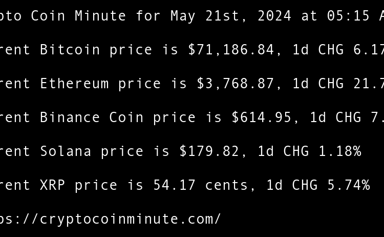 Current Bitcoin price is $71,186.84, 1d CHG 6.17% Current Ethereum price is $3,768.87, 1d CHG 21.73% Current Binance Coin price is $614.95, 1d CHG 7.32% Current Solana price is $179.82, 1d CHG 1.18% Current XRP price is 54.17 cents, 1d CHG 5.74% Prometheum launches Ether …
