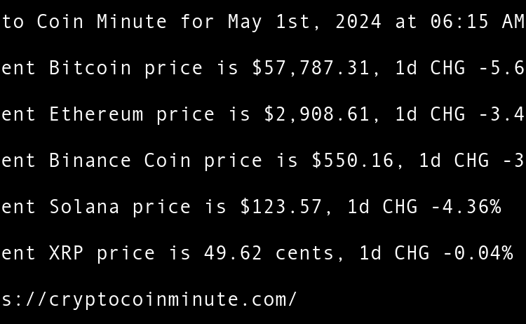 Current Bitcoin price is $57,787.31, 1d CHG -5.61% Current Ethereum price is $2,908.61, 1d CHG -3.47% Current Binance Coin price is $550.16, 1d CHG -3.09% Current Solana price is $123.57, 1d CHG -4.36% Current XRP price is 49.62 cents, 1d CHG -0.04% No signs of …