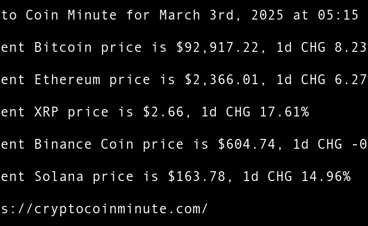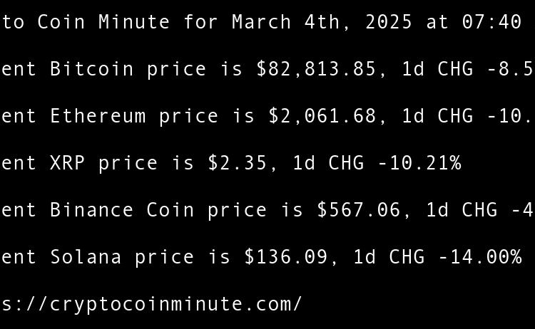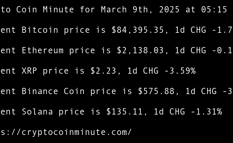 Current Bitcoin price is $84,395.35, 1d CHG -1.76% Current Ethereum price is $2,138.03, 1d CHG -0.17% Current XRP price is $2.23, 1d CHG -3.59% Current Binance Coin price is $575.88, 1d CHG -3.01% Current Solana price is $135.11, 1d CHG -1.31% Michael Saylor Shares $100 …