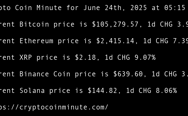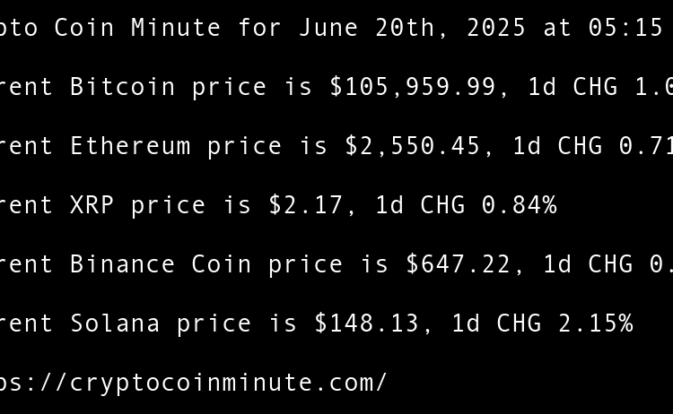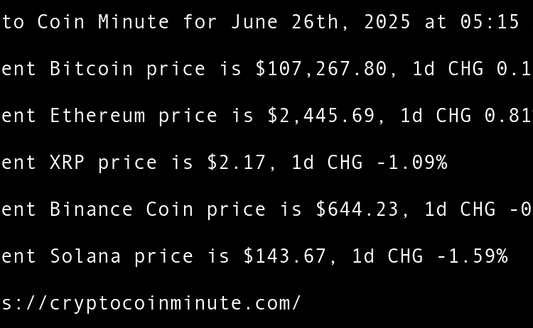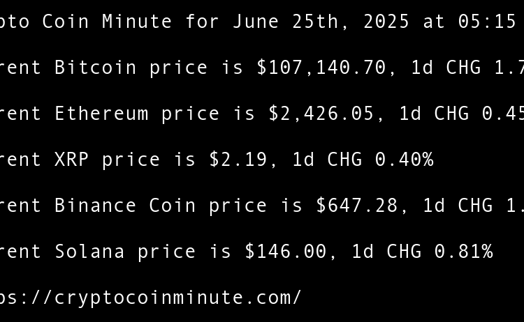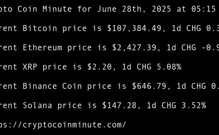Current Bitcoin price is $107,741.36, 1d CHG -0.44% Current Ethereum price is $2,462.96, 1d CHG 0.38% Current XRP price is $2.18, 1d CHG -0.58% Current Binance Coin price is $654.49, 1d CHG 0.59% Current Solana price is $150.47, 1d CHG -0.43% Bitcoin Holds Steady as …