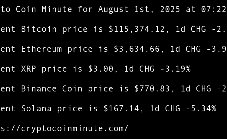 Current Bitcoin price is $115,374.12, 1d CHG -2.35% Current Ethereum price is $3,634.66, 1d CHG -3.90% Current XRP price is $3.00, 1d CHG -3.19% Current Binance Coin price is $770.83, 1d CHG -2.73% Current Solana price is $167.14, 1d CHG -5.34% Push for liquid staking …