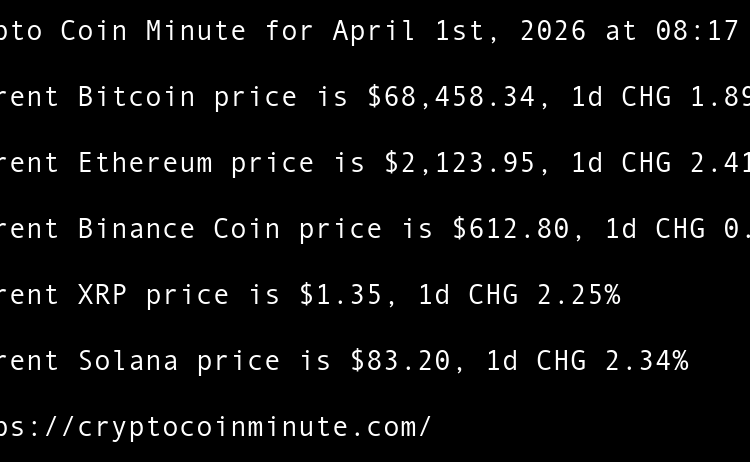 Current Bitcoin price is $68,458.34, 1d CHG 1.89% Current Ethereum price is $2,123.95, 1d CHG 2.41% Current Binance Coin price is $612.80, 1d CHG 0.51% Current XRP price is $1.35, 1d CHG 2.25% Current Solana price is $83.20, 1d CHG 2.34% Bitcoin-Backed Bonds Receive First …