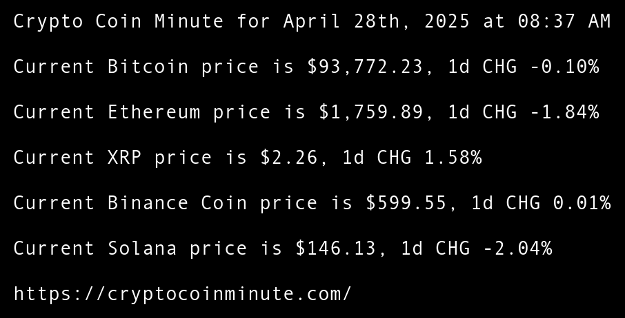 Current Bitcoin price is $93,772.23, 1d CHG -0.10%
