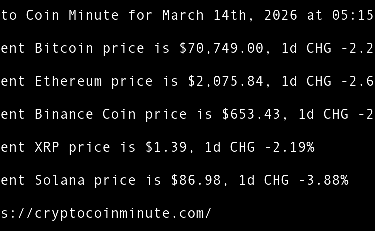Crypto Coin Minute for March 14th, 2026 at 05:15 AM Pacific Time.