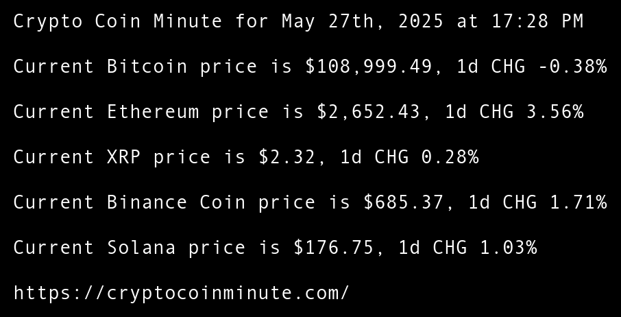 Crypto Coin Minute for May 27th, 2025 at 17:28 PM Pacific Time.