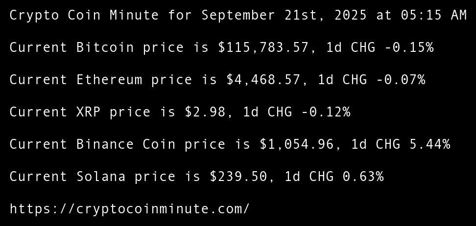 Crypto Coin Minute for September 21st, 2025 at 05:15 AM Pacific Time.
