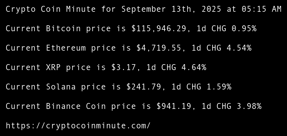Crypto Coin Minute for September 13th, 2025 at 05:15 AM Pacific Time.