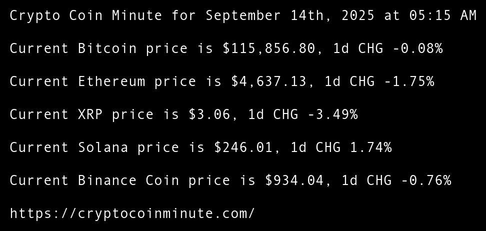 Crypto Coin Minute for September 14th, 2025 at 05:15 AM Pacific Time.