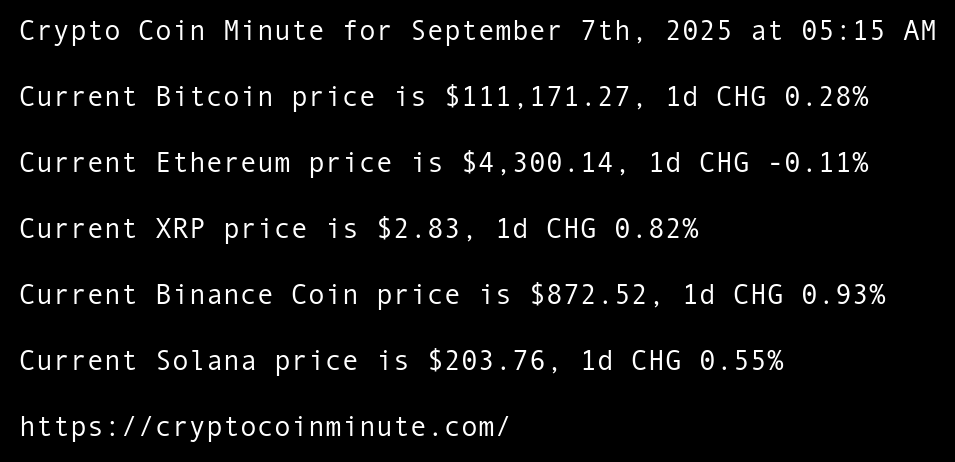 Crypto Coin Minute for September 7th, 2025 at 05:15 AM Pacific Time.