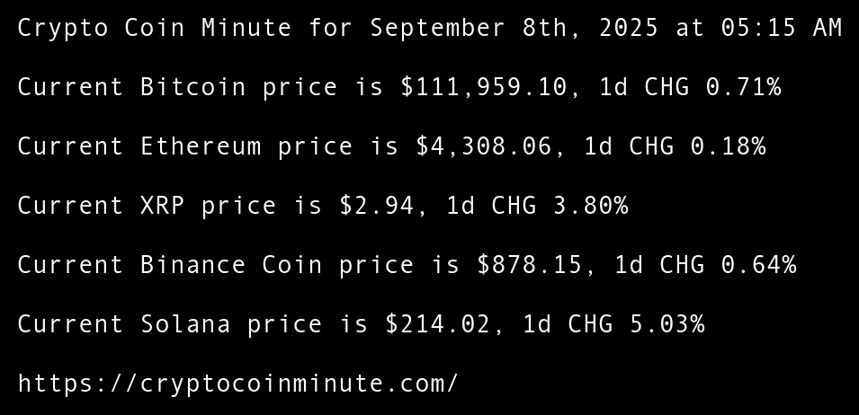 Crypto Coin Minute for September 8th, 2025 at 05:15 AM Pacific Time.