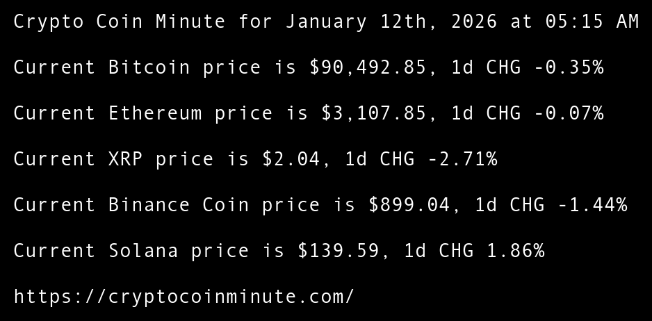 Crypto Coin Minute for January 12th, 2026 at 05:15 AM Pacific Time.
