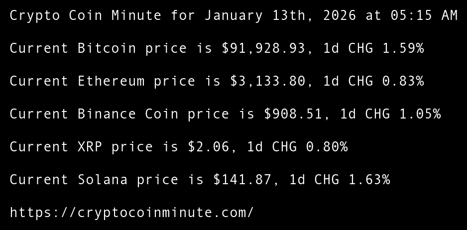Crypto Coin Minute for January 13th, 2026 at 05:15 AM Pacific Time.