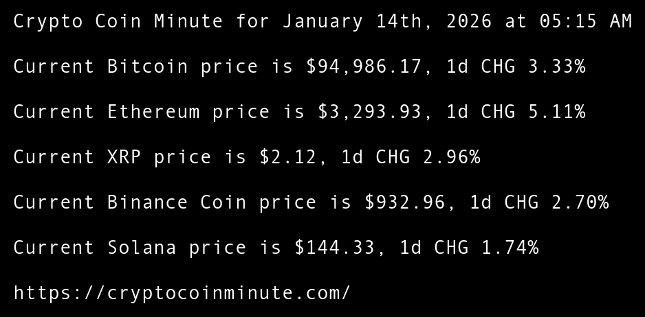 Crypto Coin Minute for January 14th, 2026 at 05:15 AM Pacific Time.