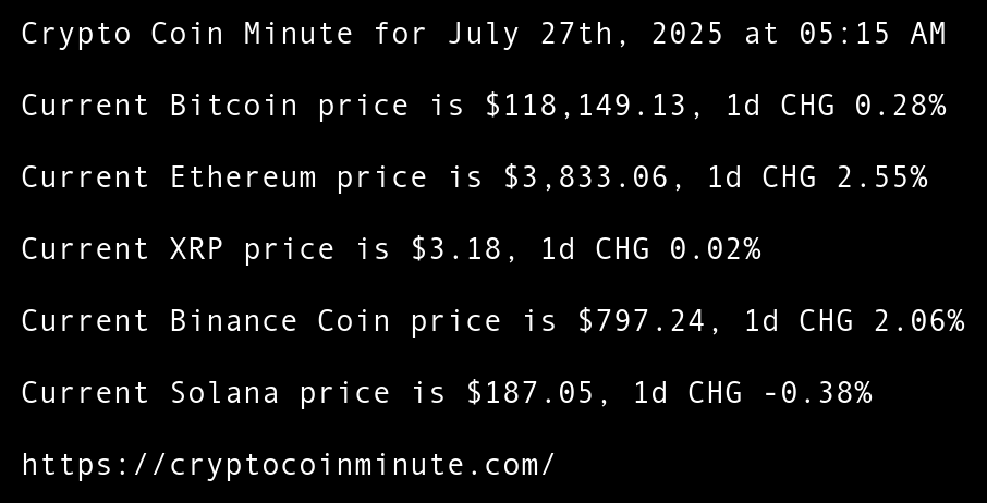 Crypto Coin Minute for July 27th, 2025 at 05:15 AM Pacific Time.