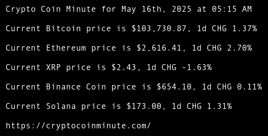 Crypto Coin Minute for May 16th, 2025 at 05:15 AM Pacific Time.