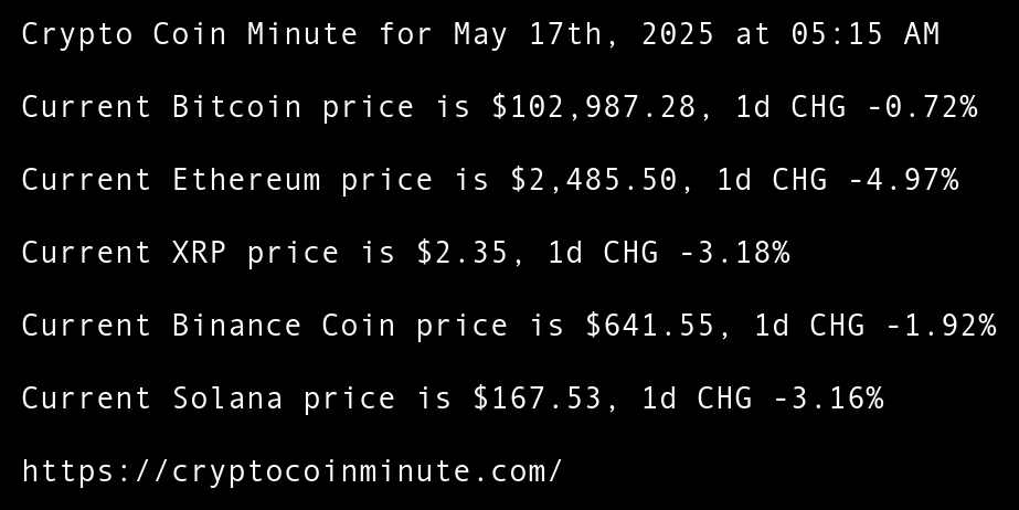 Crypto Coin Minute for May 17th, 2025 at 05:15 AM Pacific Time.
