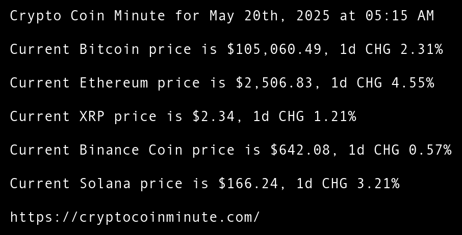 Crypto Coin Minute for May 20th, 2025 at 05:15 AM Pacific Time.