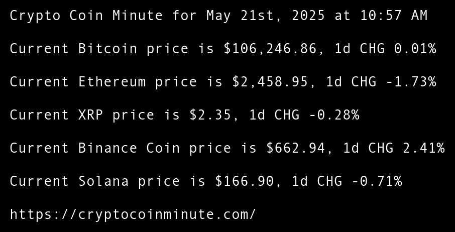 Crypto Coin Minute for May 21st, 2025 at 10:57 AM Pacific Time.